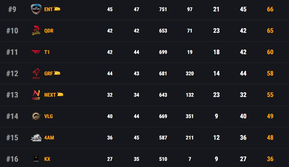 战队榜方面,EM拿到59个淘汰排名第一,GEN与TITAN各有52次淘汰排名二三位。