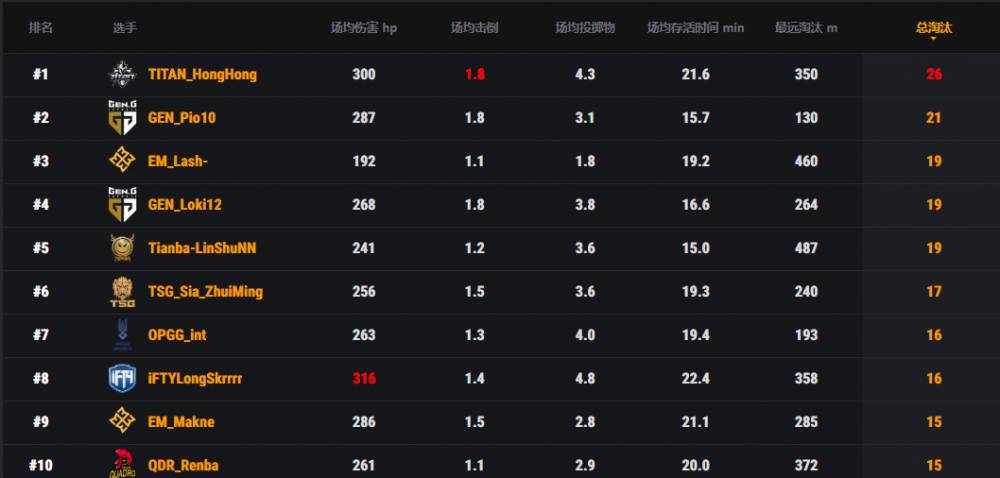 个人榜方面,TITAN战队HonHong单人拿到26个淘汰排名第一,GEN两人进入前五。