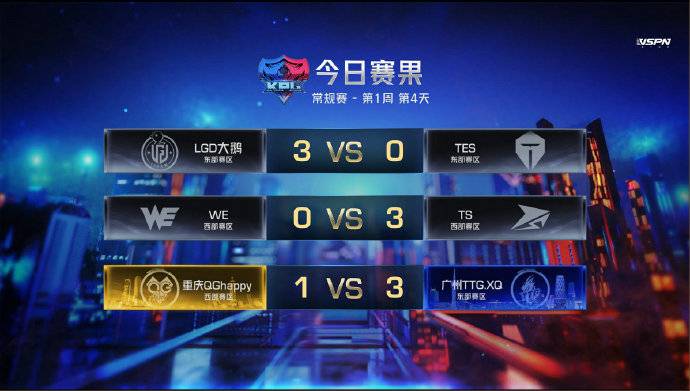 TS两战全胜,积2分,位列西部第一;DYG、GK、成都AG超玩会并列第二。
