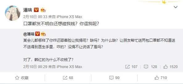 对于外界的质疑和抨击,潘石屹和SOHO中国都保持了沉默,并未回应,也没有捐赠行动。然而,倒是潘石屹的大儿子潘瑞看不下去了,在微博疑似力挺父亲,称“口罩都发不明白,还想碰我钱?”不过,微博已经删掉,但这番言论无疑让潘石屹陷入更大的舆论漩涡。