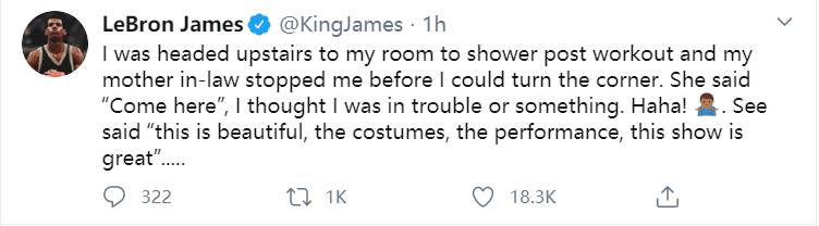 “训练结束后,我正准备上楼去我的房间里洗澡,在我走到转角处之前,我的岳母大人叫住了我。她说‘过来’,我还以为我惹上麻烦了,哈哈。她说‘这(节目)很棒,服装、表演都很棒,总之这个节目很棒。’......”詹姆斯写道。
