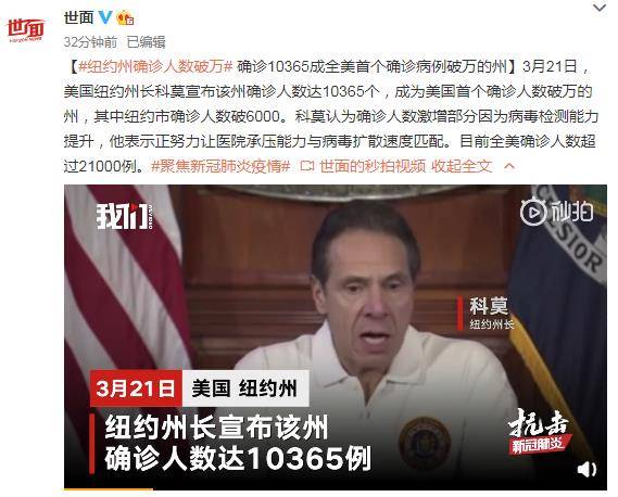 3月22日讯 当地时间3月21日,美国纽约州长科莫宣布该州确诊人数达10365个,成为美国首个确诊人数破万的州,其中纽约市确诊人数破6000。