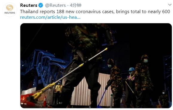 路透社:泰国新增188例新冠肺炎确诊病例 累计599例2020-03-22 16:15:12 路透社3月22日讯 根据路透社报道,一位卫生部官员表示,