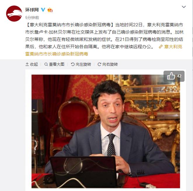 意大利克雷莫纳市市长确诊感染新冠病毒2020-03-22 18:45:52 微博3月22日讯当地时间22日,意大利克雷莫纳市市长詹卢卡-加林贝尔蒂