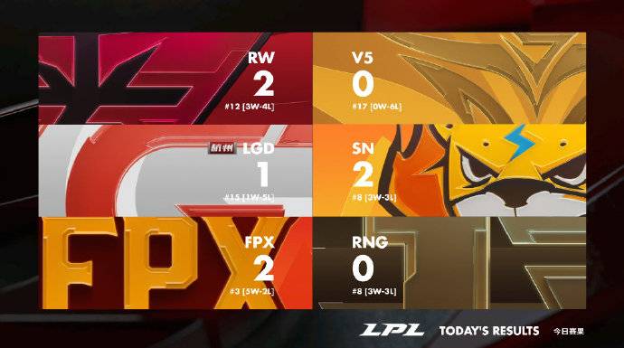 FPX凭借五连胜来到第三的位置,RNG在今天的比赛落败后目前与SN一样三胜三负排名第八,RW在战胜V5之后来到第12名的位置。