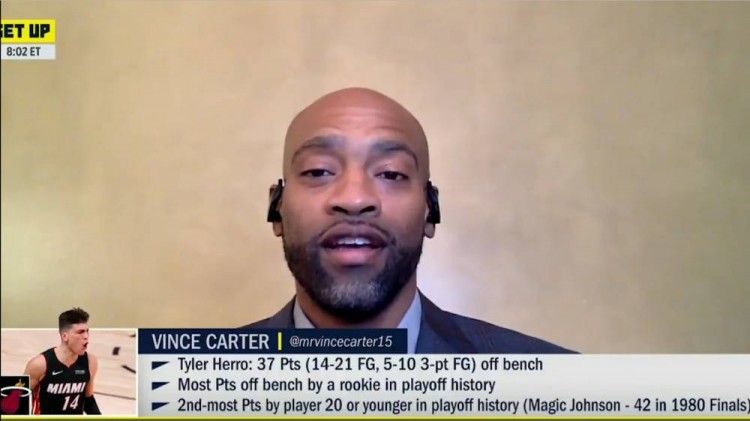 9月24日讯 文斯-卡特今日在《Get Up》节目中谈到了在今日比赛表现出色的热火队新秀泰勒-希罗。