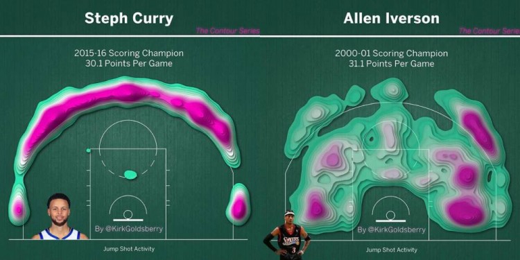 9月26日讯今天,著名数据分析师Kirk Goldsberry晒出一组图片,为库里和艾弗森MVP赛季的投篮热图(如上)。