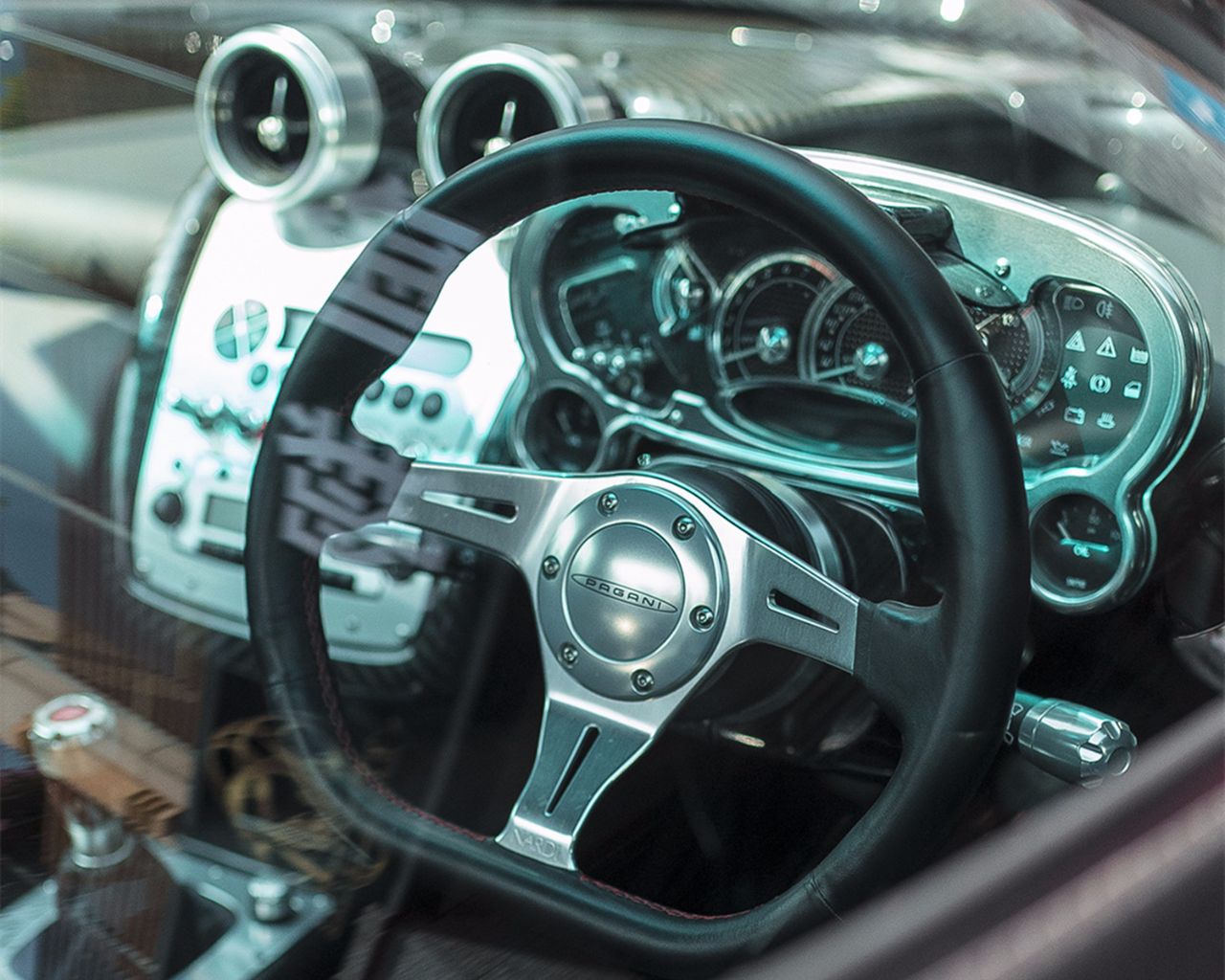 来到帕加尼 Zonda F的内饰,除了皮革之外,碳纤维和铝材是用的最多的材质。方向盘,换挡杆,手刹拉杆还有意大利家具的木材装饰。中控台的布局对车迷来说已经不陌生了,中控面板上的各种功能控制都用了很有复古味道的拨杆,仪表盘发风格也非常简单,这样看过去是不是有点老爷车的感觉呢?它可没有换挡拨片,左手边有一个换挡杆,换挡杆的顶端还有一个红色的引擎启动按钮,轻轻一按,V12引擎就转动了。