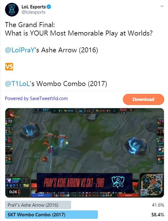 9月26日讯 近日LOL官推开展的世界赛名场面票选投票的冠军产生,最终SKT完美Combo翻盘EDG以58.4%的得票率击败 Pray寒冰一箭 获得最后的冠军!
