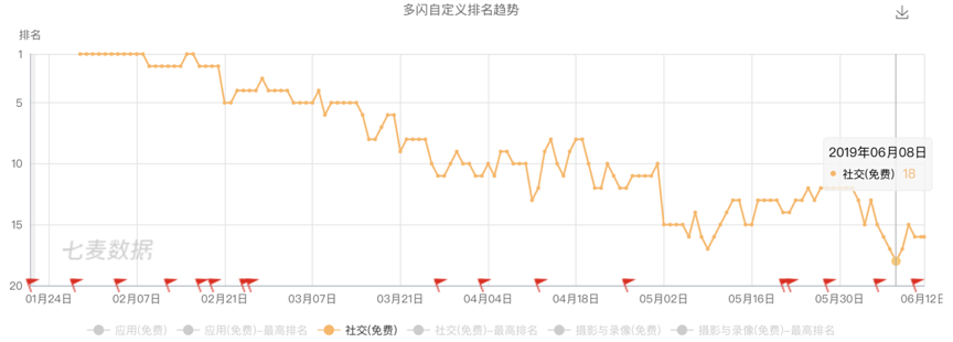 多闪:24小时内注册用户破100万,2019年除夕当晚,“瓜分1亿红包”的活动令多闪下载量达到46万,全平台日活超过1000万,达到历史峰值。但这一阶段过后,多闪数据开始持续下滑,此后,多闪还先后获得了抖音、FaceU的导流,但整体数据依然不见起色。