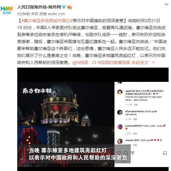 塞尔维亚多地建筑亮起红灯 向中国援助深深致谢2020-03-23 12:11:09 微博3月23日讯 当地时间3月21日19:30分,中国6人专家医疗队抵