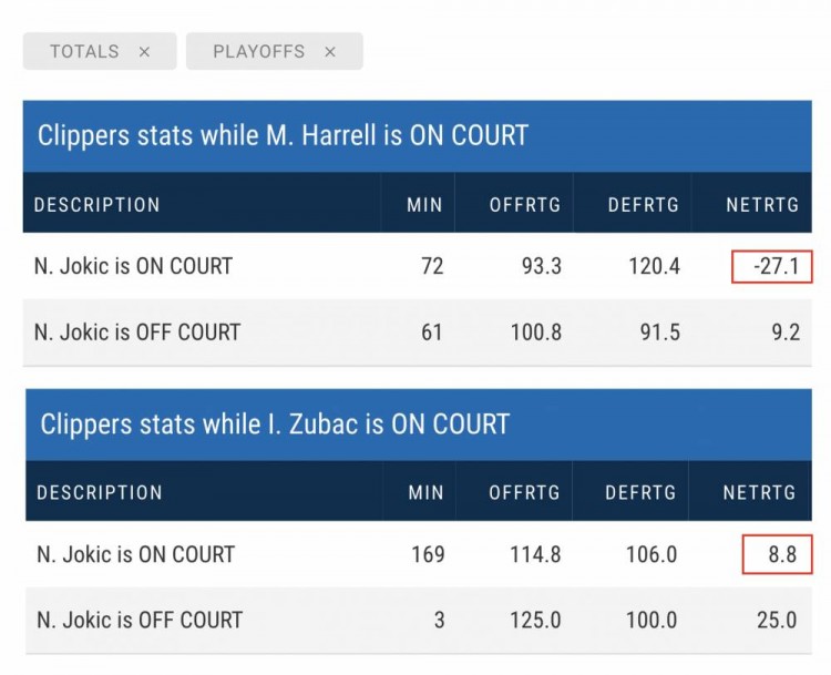 如上图所示,当祖巴茨对位约基奇时,快船每百回合净胜对手8.8分。