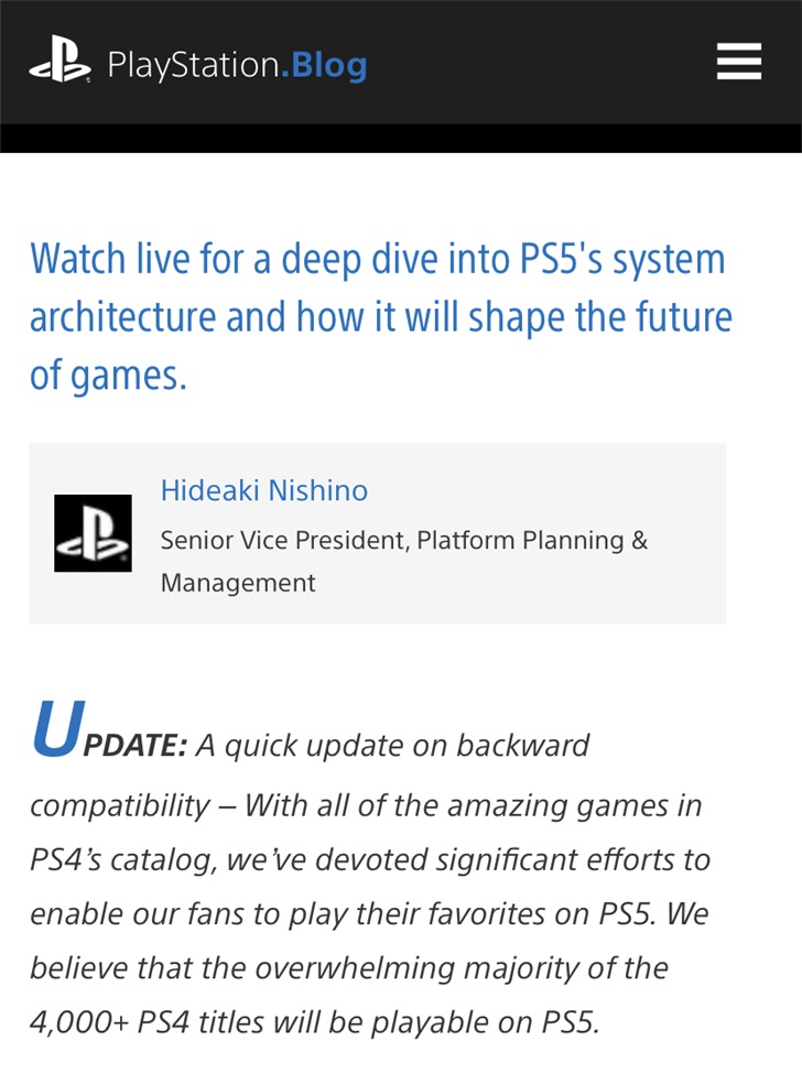 IT之家了解到,索尼已在此前的博客文章中介绍了索尼PS5的具体规格,其搭载了AMD八核Zen 2处理器,主频最高可达3.5GHz,GPU频率为为2.23GHz,具备2304流处理器,内存为16GB,搭载一块825GB SSD硬盘,拥有NVMe插槽。此次确认的对4000余款PS4游戏的支持对于广大玩家而言的确是个好消息,不过目前官方尚未给出详细的兼容计划,游戏最后的兼容效果及游玩体验仍尚不可知。