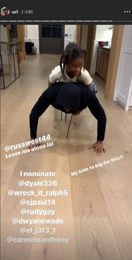 “@威少,让我静静,哈哈。我的孩子对于这个挑战有点太大只了!!”保罗写道,同时还点名韦德、阿里扎和安东尼等人。