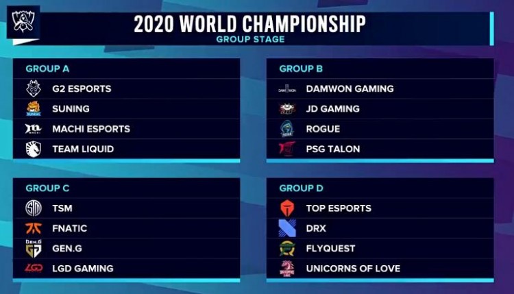 小组赛已分组完毕:A 组:G2 SN MCX TLB 组:DWG JDG RGE PSGC 组:TSM FNC GEN LGDD 组:TES DRX FLY UOL