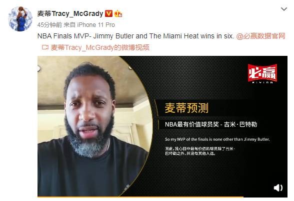 麦迪在视频中表示,总决赛中得分最高的球员将是浓眉,但热火将在6场内拿下总冠军,并且巴特勒会当选FMVP。