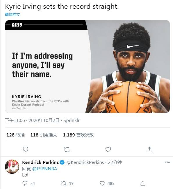 随后,在一条美媒报道欧文澄清言论的推特下,NBA评论员帕金斯回复道:LOL(Laugh Out Loud大笑)。