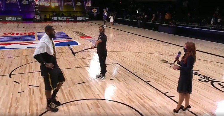 直播吧10月3日讯刚刚结束的NBA总决赛,湖人124-114战胜热火,大比分2-0暂时领先。赛后,湖人球星詹姆斯在场边接受了记者瑞秋的采访,瑞秋问到詹姆斯对本场比赛是否满意时,詹姆斯仍摇摇头,说到:“