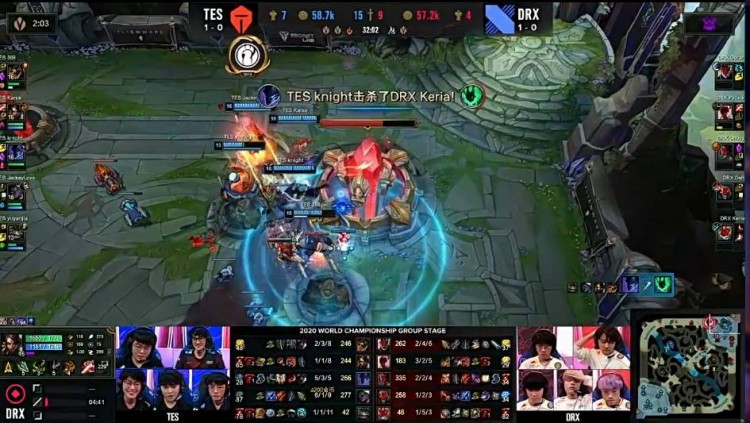 【27:15】TES河道抓到DRX埋伏的两人,正面团战打出0换2。