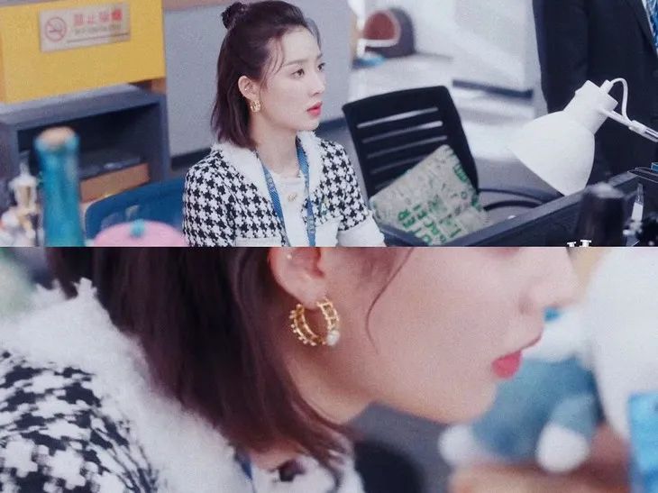 以大学刚毕业就空降公司当总裁的“傻白甜”为人设的江达琳,不仅在穿搭上还有些学生气,就连挑耳饰的眼光也是如此。