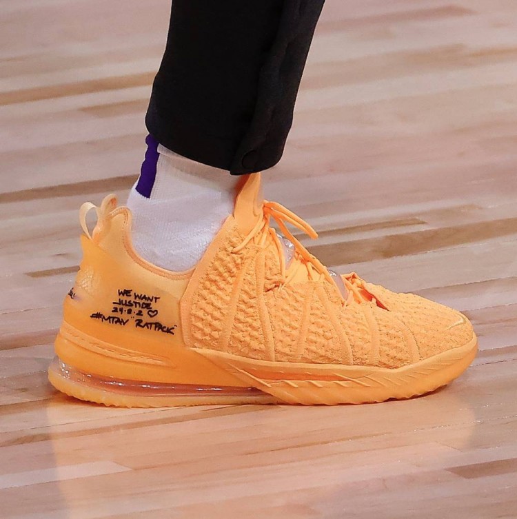直播吧10月7日讯总决赛G4今日开打,詹姆斯穿着一双橙黄色的新款Lebron18登场。据悉,这双鞋的脚后跟位置印有24-8-2的数字,代表了科比和吉安娜的球衣号码。老詹在鞋上写了“我们要公平”、“阿克