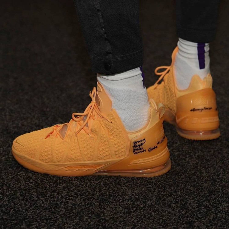 10月7日讯总决赛G4今日开打,詹姆斯穿着一双橙黄色的新款Lebron 18登场。
