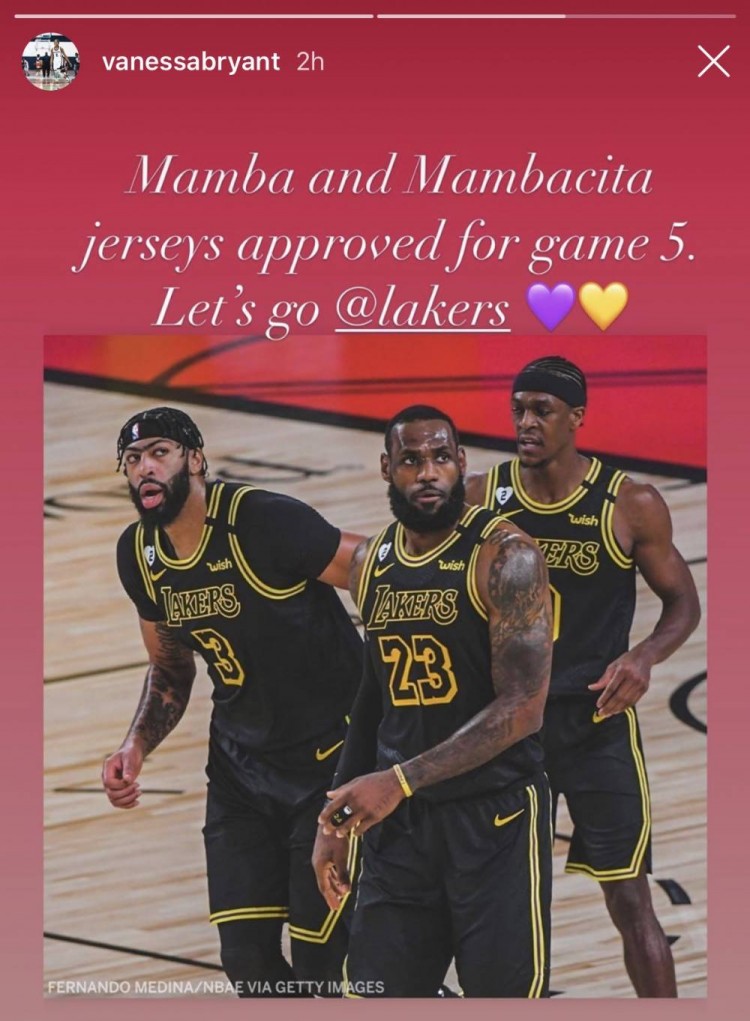“湖人已获准在G5身穿黑曼巴球衣,加油湖人!”瓦妮莎写道。