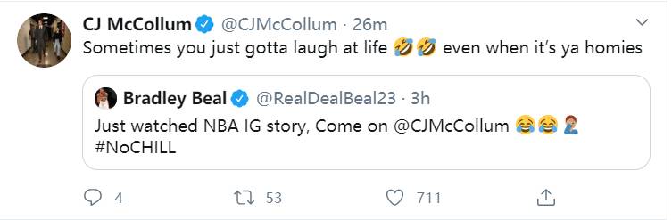 奇才后卫比尔在ins上看到了CJ的直播,并就此事@了CJ。“刚刚看了有关NBA的IG story,得了吧CJ。”比尔写道。