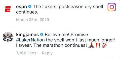 “相信我!我向湖人国度承诺,黑夜不会再继续笼罩我们!我发誓。马拉松继续!!”詹姆斯在媒体关于湖人连续6年无缘季后赛报道的评论中写道。