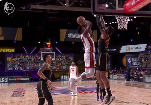 当湖人使用霍华德为5号位的传统双塔阵容,热火挡拆手递手掩护持续追打霍华德;当湖人使用浓眉为5号位的小阵容,巴特勒单挑找库兹马、大莫里斯予取予求——巴特勒G3面对大莫里斯打进致胜上篮,热火外围又有邓罗、希罗两杆无限开火权的三分射手,巴特勒和邓罗、希罗共同在场时逼迫湖人即使在使用小球阵依然必须绕过掩护追防守人的畸形化防守方式。