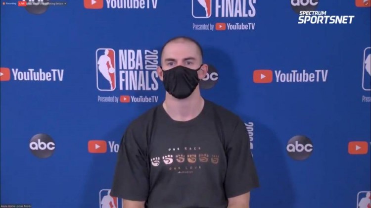 赛后,湖人队球员卡鲁索出席新闻发布会,接受了记者的采访。