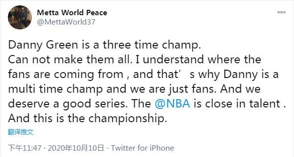 “丹尼-格林是三届总冠军。他不可能把所有的球都投进去。我理解球迷们的反应,这也是为什么丹尼能多次拿到总冠军,而我们只是球迷。NBA球队在天赋上是很接近的,这就是总决赛。”慈世平在推特上写道。