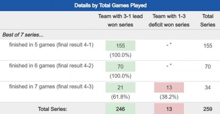 据数据统计,史上一共出现过259次3比1的情况,其中155次,3比1领先的球队在第五战就拿下了系列赛(155/259,胜率59.8%);