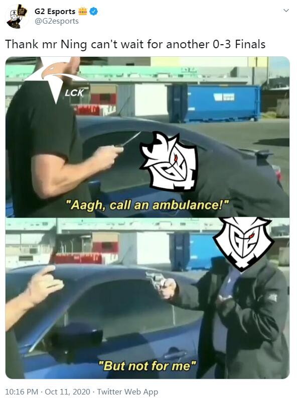 G2官推:谢谢你宁人,迫不及待下一个决赛3-0了2020-10-11 22:50:14 Twitter 10月11日讯 在八强结果出炉后,G2和三支LCK队伍分在