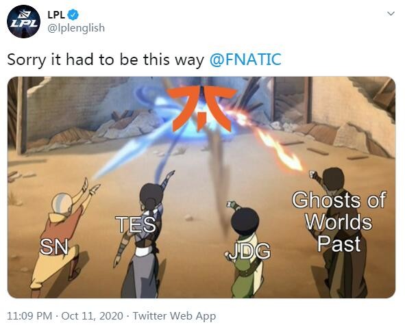 LPL官推喊话FNC:很抱歉事情会变成这样2020-10-11 23:22:19 Twitter 10月11日讯 八强抽签结束后,FNC被分在了三支LPL队伍的半区