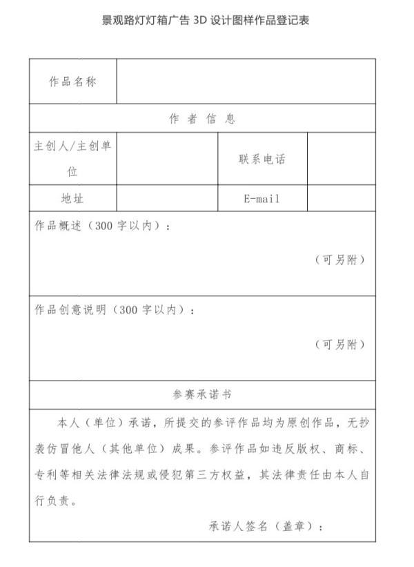 1.每组参评作品提交《景观路灯灯箱广告3D设计图样作品登记表》和A3纸质高分辨率彩色3D设计图样(注明尺寸比例等)、效果图、设计说明。电子版发送到指定邮箱,纸质版邮寄或当面递交,并注明投稿人的姓名、地址、手机等联系方式。