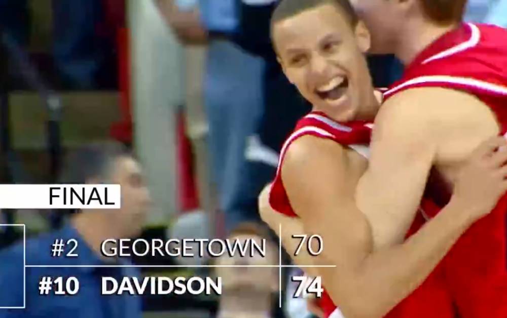 3月24日讯2008年的今日,库里率领自己的母校戴维森学院下克上战胜了乔治城大学。