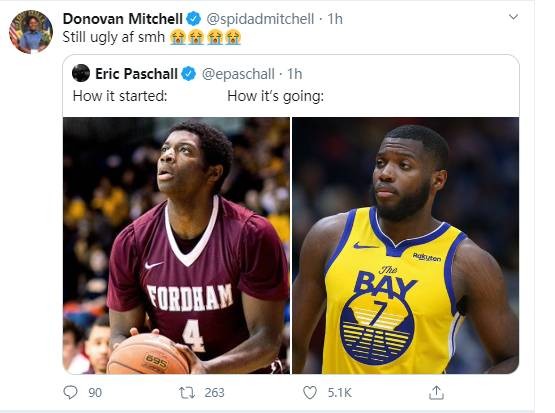 直播吧10月14日讯今日,勇士前锋帕斯卡尔在推特晒出了两张自己大学时期的照片并配文说到:“如何开始的,如何进展的。”爵士后卫米切尔转发了这条推特并评论道:“淦,还是那么丑,真tm无奈