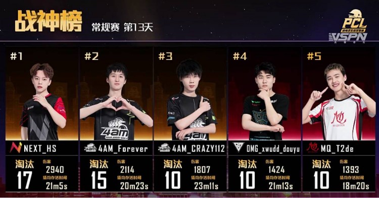 10月14日讯 2020PCL秋季赛常规赛十三日全部结束,今日最终由NEXT、DLG、XJ、XJ、MQ、OMG成功吃鸡。
