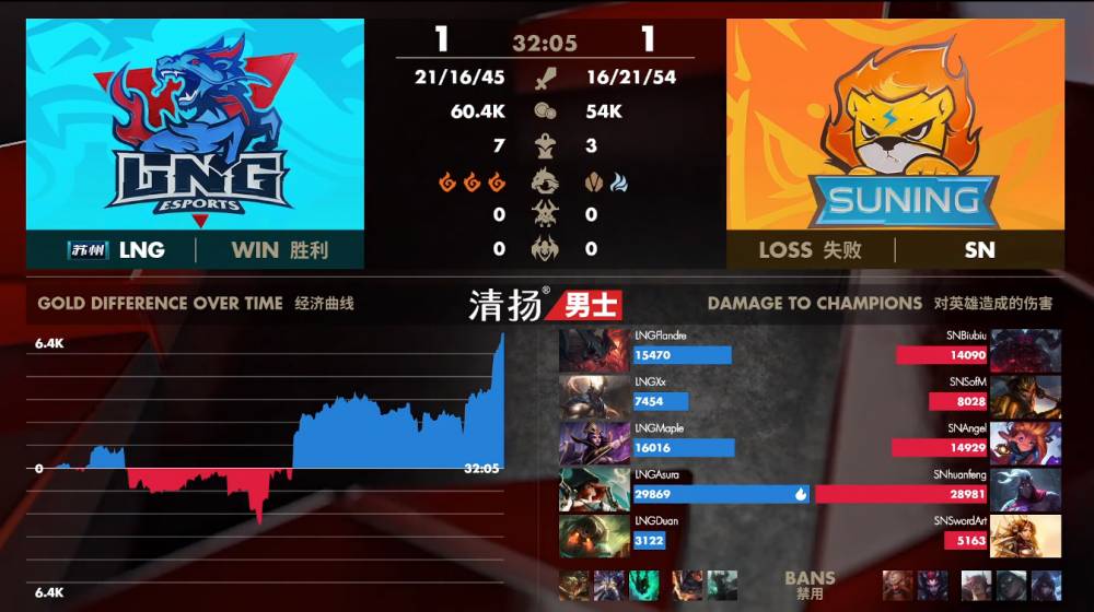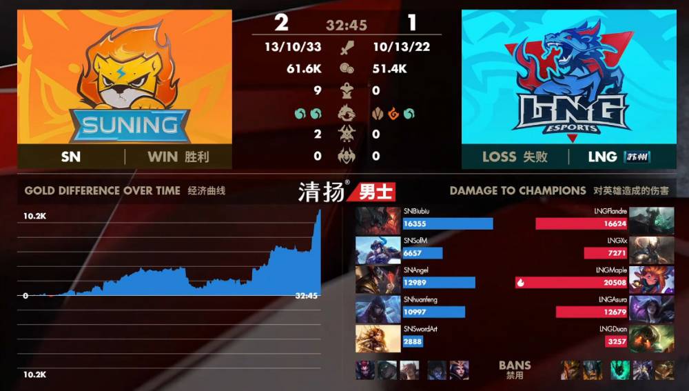 【32:05】LNG强开大龙,SN前来防守。SN猪妹抢下大龙后团灭LNG,一波结束比赛。