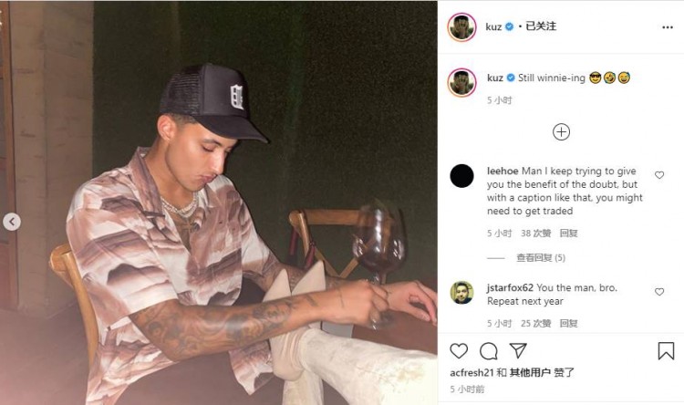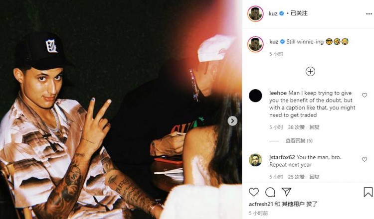 库兹马的女友也在其个人Ins上晒出了和库兹马的合照,库兹马在底下评论道:“