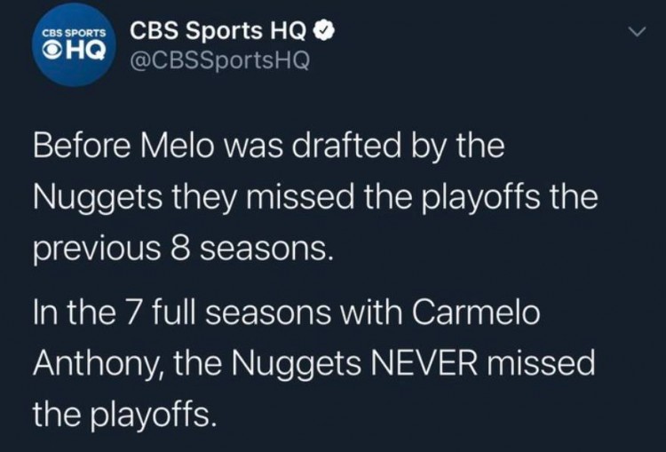 CBS体育是其中之一,今天,他们在官推上列出了这样一组数据:在选中甜瓜之前,掘金已经8年没有进过季后赛,拥有甜瓜的7个赛季,他们从未缺席过季后赛。