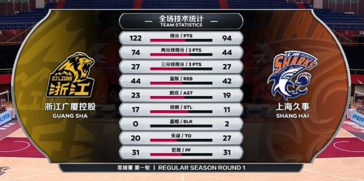 广厦:孙铭徽41分7助7断、胡金秋31分12板、赵岩昊15分6板、李金效9分7板、李京龙10分4板