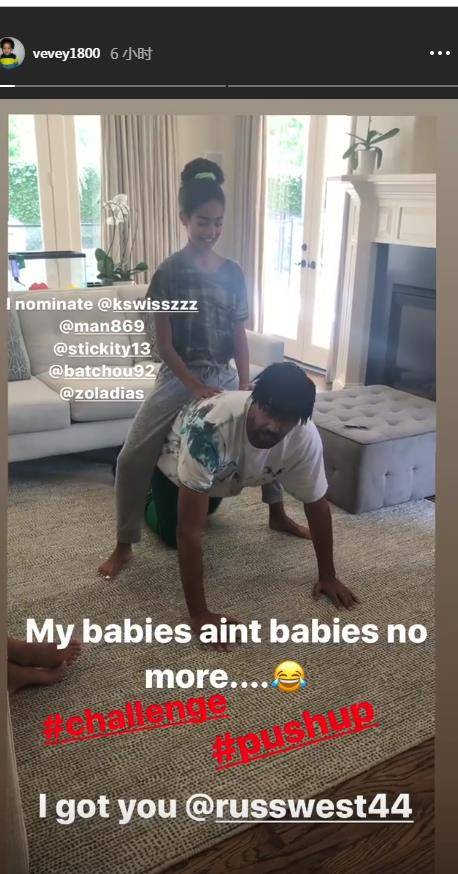 3月25日讯 受新冠影响NBA球员均闲赋在家,拉塞尔-威斯布鲁克发起了背娃做俯卧撑挑战。