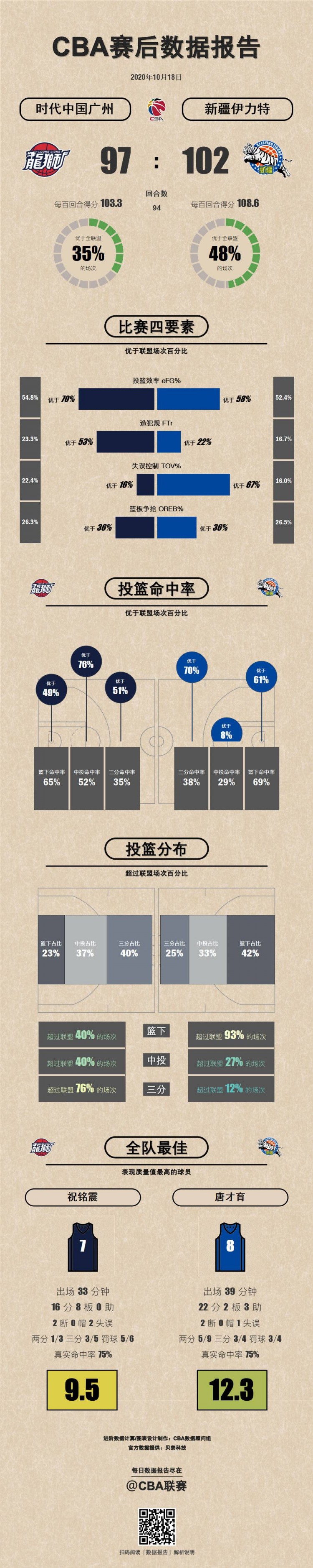10月18日讯 在今晚的CBA常规赛中,新疆以102-97逆转击败广州。赛后,CBA官方给出了本场比赛的数据报告。