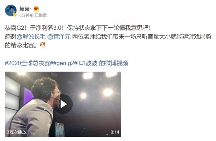 10月18日讯 S10淘汰赛第四日G2成功击败GEN晋级四强,赛后解说鼓鼓更博恭喜G2并配文:感谢@解说长毛 @管泽元 两位老师给我们带来一场只听音量大小就能辨游戏局势的精彩比赛。
