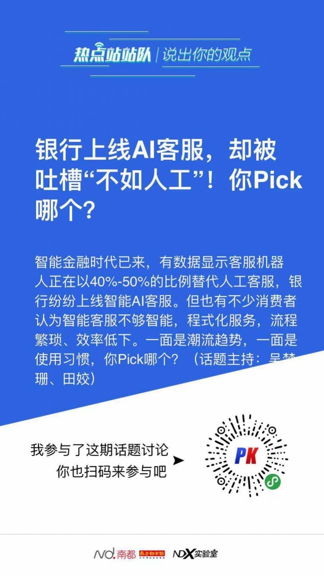 作为AI+金融的典型场景之一,消费者对智能客服的观感、使用体验是管窥“金融科技如何兼顾温度与效率”的重要切口。为此,NDFRI特别展开调查——“银行上线AI客服,却被吐槽‘不如人工’!你Pick哪个?”以了解消费者的真实态度。