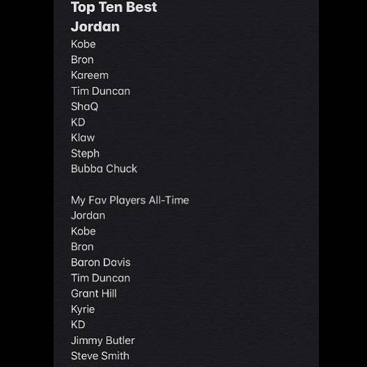 3月25日讯前NBA球员史蒂芬-杰克逊在社交媒体上晒出了个人心中的历史 最喜欢球员Top10,其中乔丹、科比和詹姆斯在两项中均排在前三。