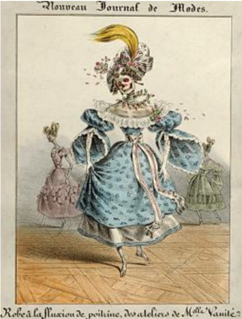 中,将“时尚”拟人化,称为死神的姐妹。“时尚”骄傲地宣称,她最爱玩死亡游戏,“被鞋子禁锢的蹒跚世人,束身衣让他们透不过气,眼珠鼓起……我好心劝慰,试图让这些绅士免受苦楚,然而,他们爱我,宁受每日千般折磨,万般痛苦,就算因此光荣就义,也要爱我。”