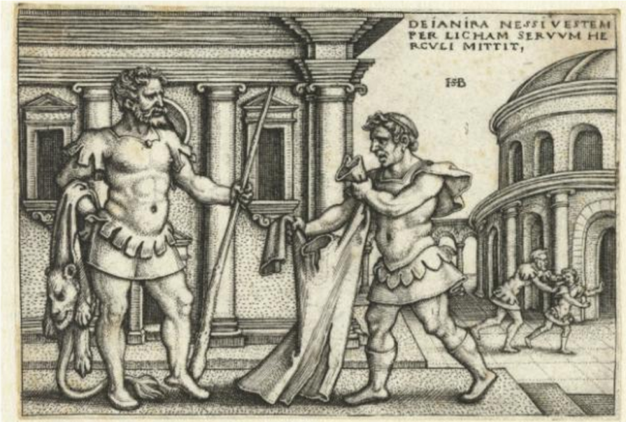 ”。在这则神话故事里,英雄赫拉克勒斯在与人首马身的涅索斯决斗时,没有面对面来场男子汉式的决斗,而是暗箭伤人,射中了这位会飞的敌人的背部,还在箭头上淬了从毒蛇口中提取的毒液。作为报复,死之前,涅索斯骗得赫拉克勒斯的妻子达吉丽亚的信任,让达吉丽亚误以为涅索斯的血液是一种爱情魔药,能使爱人永保忠诚,于是取了一小瓶血液保存起来。